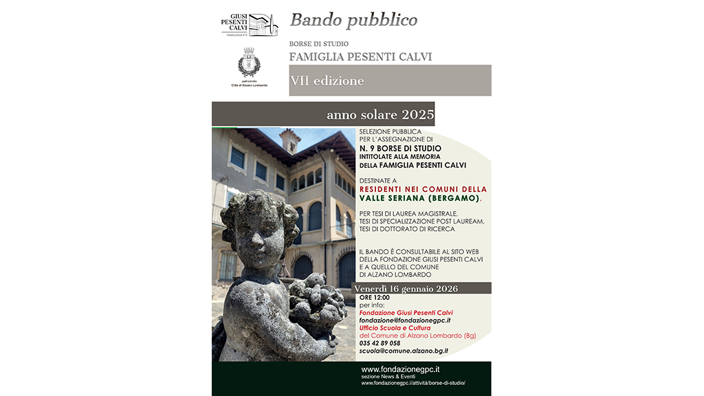 In ottemperanza alle disposizioni testamentarie del dott. Giuseppe Pesenti Calvi è bandita la settima edizione delle Borse di Studio in memoria della Famiglia Pesenti Calvi, per tesi di Laurea Magistrale o titoli superiori discusse nell’anno solare 2025 da parte di studenti residenti in Valle Seriana. Per ogni info: segreteria@fondazionegpc.it